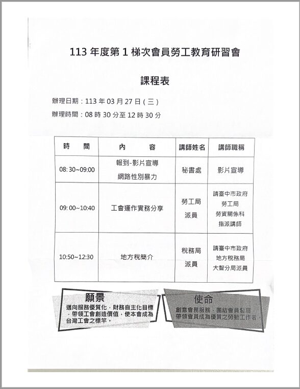 台中市總工會113年度第1梯勞工教育研習營,歡迎各位會員好朋友報名參加!